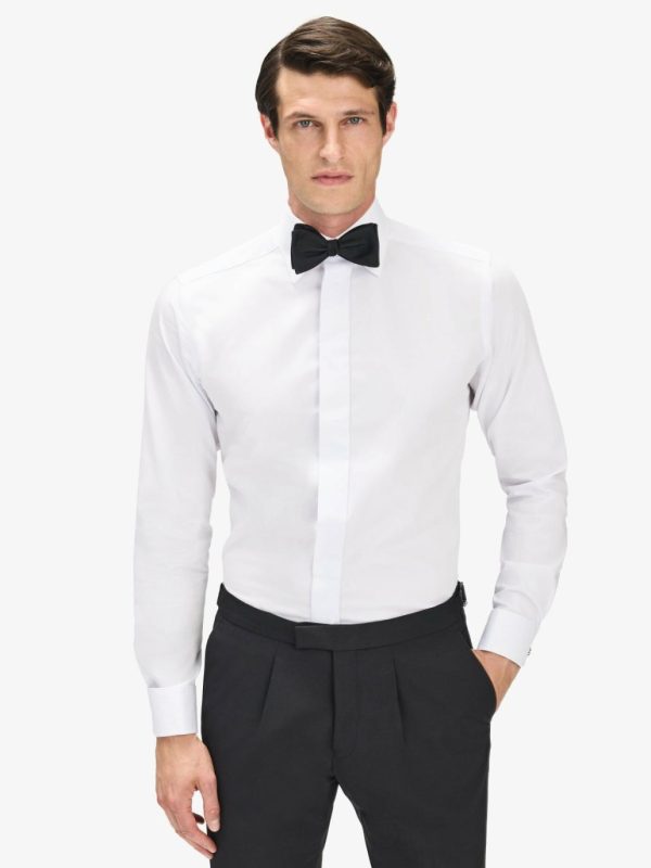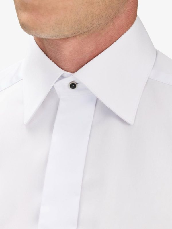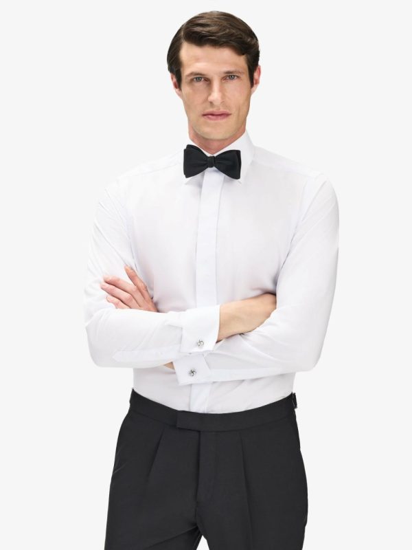 Timeless details such as the evening cut away collar, hidden buttons with one visible black top button and French cuffs create a perfect black-tie shirt.